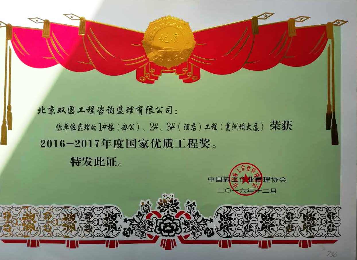 近日我公司監(jiān)理的葛洲壩大廈(1#辦公樓,2#、3#酒店)獲得中國施工企業(yè)管理協(xié)會頒發(fā)的《2016-2017年度國家優(yōu)質工程獎》。
