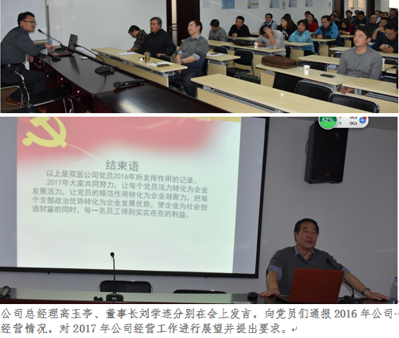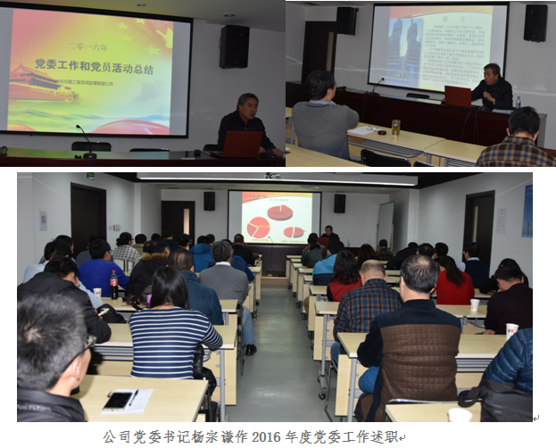 公司黨委于2017年1月6、19日分別召開黨員大會,并邀請部分黨員群眾參加,會議由公司黨委副書記、副經理郭勁光主持。會上,黨委書記楊宗謙對一年來開展黨建工作情況進行了全面地總結、述職,并認真聽取了大家的意見和建議。公司黨委嚴格考評工作程序,以測評打分的形式,采取百分制,以黨組織“五個好”為標準,圍繞“黨內事務、服務群眾、凝聚社會“等方面內容,對公司黨委和所屬三個黨支部進行了測評打分。
