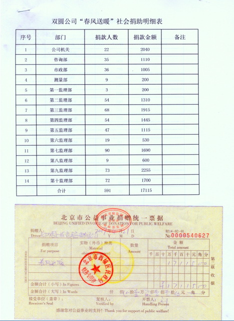 根據(jù)月壇街道辦事處下發(fā)西城區(qū)民政局關(guān)于在全區(qū)開展2017年“春風送暖”社會捐助活動的通知(西民發(fā)【2017】4號)文件精神,雙圓監(jiān)理公司于2017年4月19至21日,在公司范圍內(nèi)組織開展了“春風送暖”社會捐助聯(lián)合募捐活動。