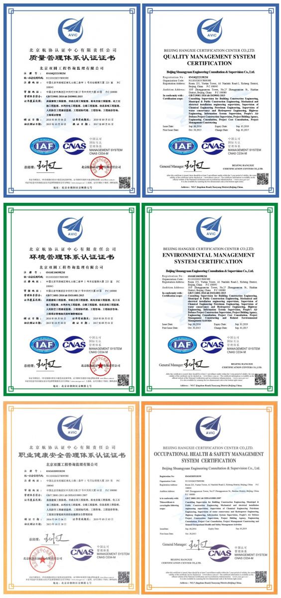 我公司于1997年通過了質量體系認證,于2004年通過了環境、職業健康安全管理體系認證,并于2008年進行了質量、環境、質量健康及安全管理體系的整合工作,至今公司管理體系已持續運行二十年。北京雙圓工程咨詢監理有限公司在今后的工作中將持續推進管理體系運行,在體系平衡運行的同時,不斷尋求新的機遇,適應日益變化的市場需求。