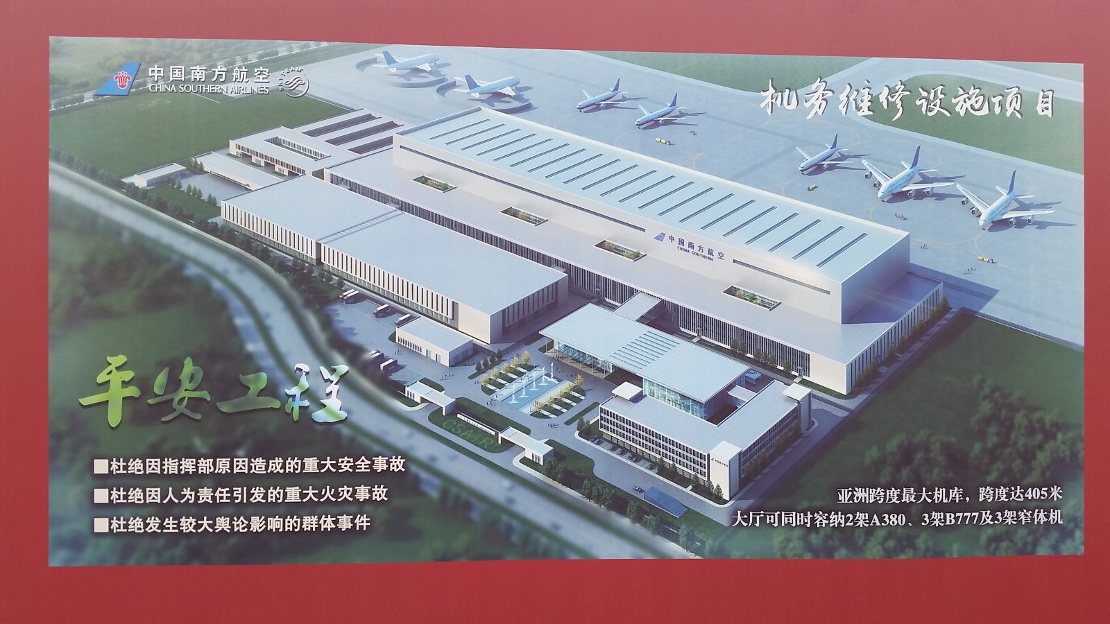 南航新機場基地項目總用地約62公頃,項目建設總規模108.69萬平方米,總投資145.5億元,建設工期650天。其中我公司中標監理機務維修項目,建設規模20.07萬平方米,包括維修機庫、航材庫及維修車間相關配套設施等單體建筑,新建機庫跨度為405米,共設維修機位8個,其中5個寬體機機位,(2個A380+3個B777),3個窄體機機位,最多可容納12架飛機同時進行維修,建成后將成為亞洲最大的飛機維修機庫,在航材管理方面,充分考慮自動化設備及信息系統的組合,建成具有國內領先水平的飛機維修智能物流供應保障系統,成為覆蓋全國和全球的維修資源保障中心。