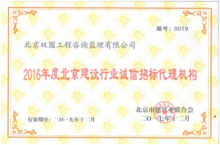 2017年12月28日北京市建設(shè)工程招標(biāo)投標(biāo)協(xié)會(huì)發(fā)布了《關(guān)于表彰2015-2016年度第二批北京建設(shè)行業(yè)“誠(chéng)信招標(biāo)代理機(jī)構(gòu)”的決定》, 41家企業(yè)被評(píng)定為2015-2016年度第二批北京建設(shè)行業(yè)“誠(chéng)信招標(biāo)代理機(jī)構(gòu)”。北京雙圓工程咨詢監(jiān)理有限公司經(jīng)北京市建設(shè)工程招標(biāo)投標(biāo)協(xié)會(huì)評(píng)定辦公室初審,專家委員會(huì)復(fù)審,網(wǎng)上公示等程序,被評(píng)定為“2016年度北京建設(shè)行業(yè)誠(chéng)信招標(biāo)代理機(jī)構(gòu)”認(rèn)證。