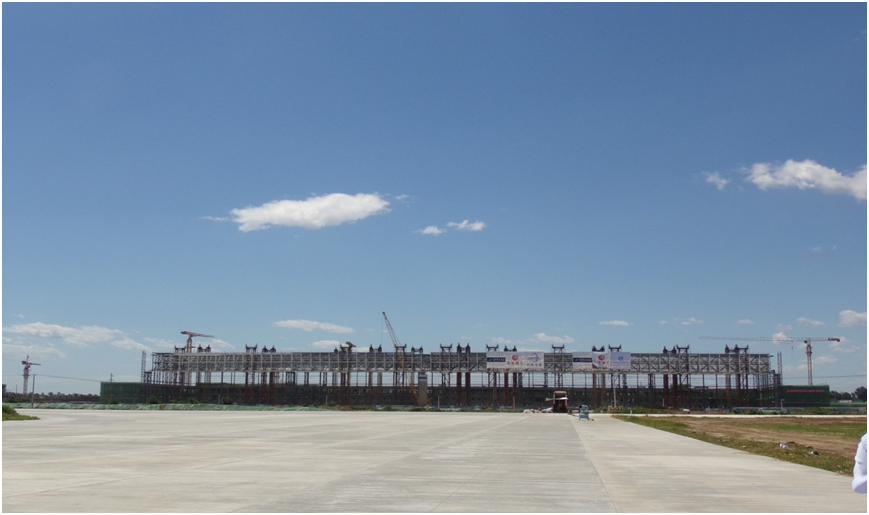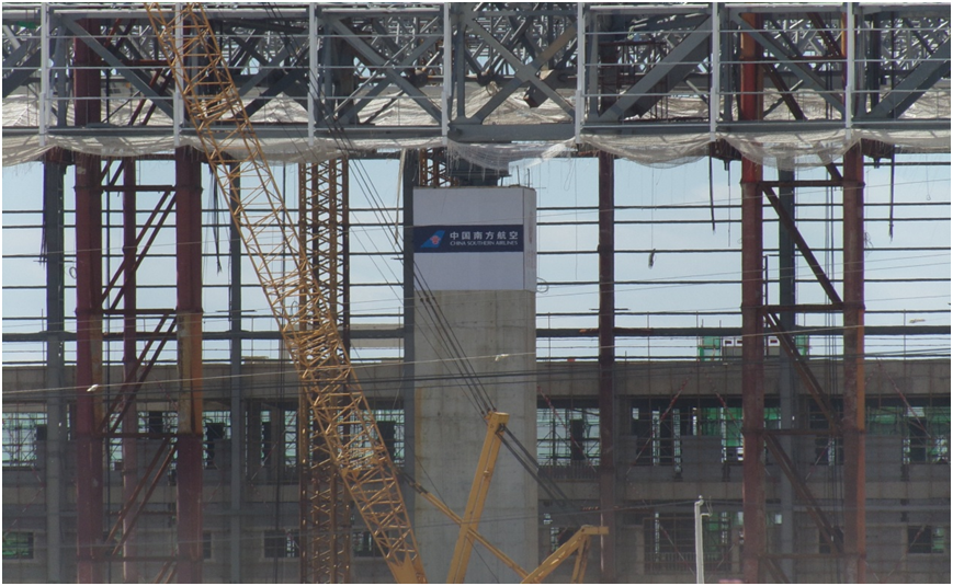 新機場南航基地1號機庫總面積達3.9萬平方米,是目前亞洲最大的飛機維修庫,工程鋼結構屋架長404.5米,寬97.5米,重7200噸。建成后將設5個寬體機機位和3個窄體機機位,最多可同時容納包括2架空客A380、3架波音777在內的12架飛機停放維修。
