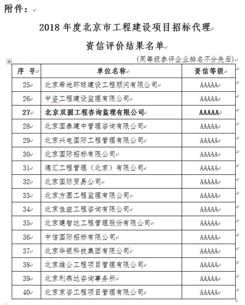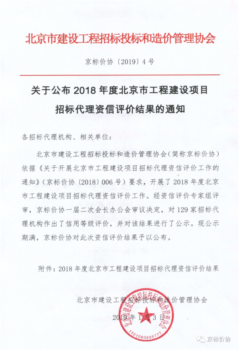 近日,北京市建設工程招標投標和造價管理協會發布了《2018年度北京市工程建設項目招標代理資信評價結果通知》,北京雙圓工程咨詢監理有限公司榮獲“2018年度北京市工程建設項目招標代理資信評價等級AAAAA級”稱號(自評定之日起有效期為五年)。
