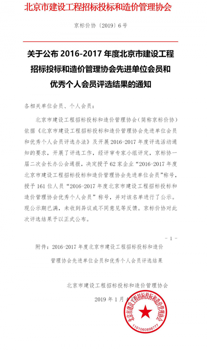 近日,協會網站發布了《關于公布2016-2017年度北京市建設工程招標投標和造價管理協會先進單位會員和優秀個人會員評選結果的通知》,我公司榮獲“2016-2017年度北京市建設工程招標投標和造價管理協會先進單位會員”稱號。