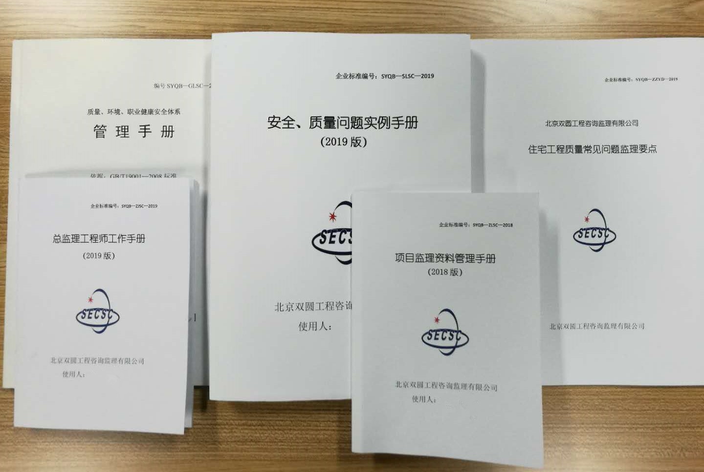 為提高北京雙圓工程咨詢監理有限公司工程咨詢以及工程監理服務水平,公司編制發布了“四個手冊、一個要點”:《質量、環境、職業健康安全管 理 手 冊》2017.1版(SYQB—GLSC—2017)、《總監理工程師工作手冊》2019版(SYQB-ZJSC-2019)、項目監理資料管理手冊》2018版(SYQB-ZLSC-2018)、《安全、質量問題實例手冊》2019版(SYQB-SLSC-2019)、《住宅工程質量常見問題監理要點》2019版 (SYQB—ZZYD—2019),現已全面實施。