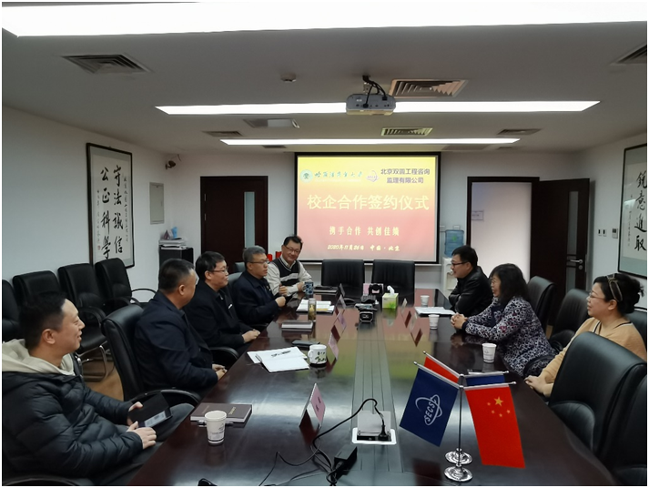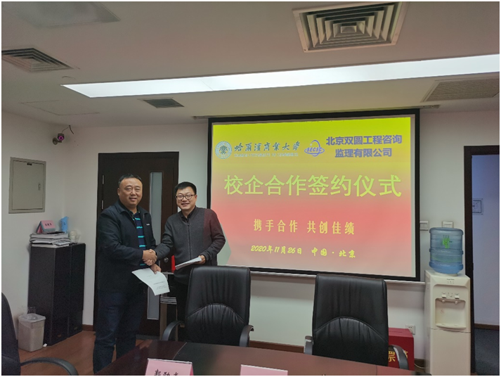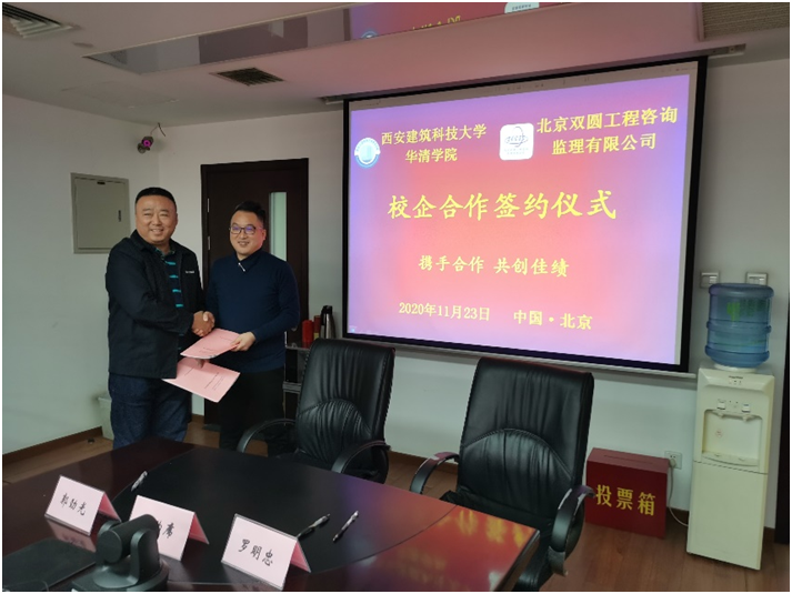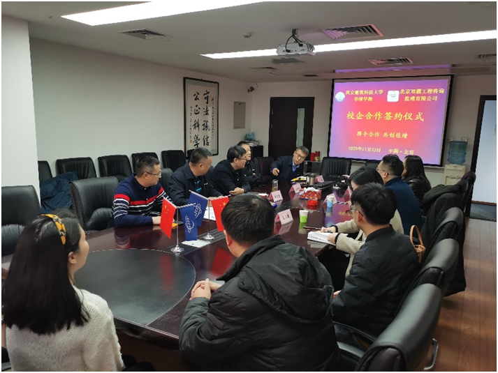 簽約儀式分別于2020年11月23日、26日在公司會議室舉行,參加簽約儀式的有:西安建筑科技大學華清學院黨委副書記、副院長、紀委書記羅明忠、學生工作部部長馬嘯塵、學生工作部副部長高小蓉;哈爾濱商業大學能源與建筑工程學院副院長楊曉莊、黨委副書記金福吉;雙圓監理公司董事長、黨委書記、總經理、副總經理、辦公室主任等相關人員。