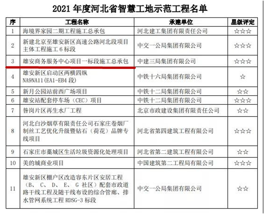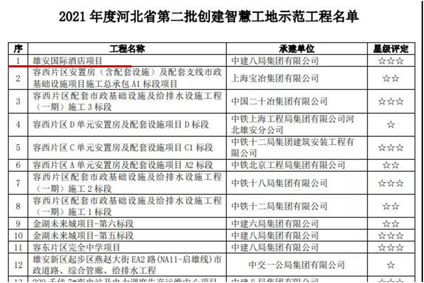 2021年11月由河北省建筑業協會、河北省工程建設信息智能化協會按照河北省《智慧工地建設技術標準》(DB13[J]/T8312-2019)及《河北省智慧工地示范工程評價管理辦法》(冀建協字[2020]12號)規范要求評定的河北省智慧工地示范工程已發布榮譽稱號名單,我公司監理的雄安商務服務中心一標段、雄安國際酒店兩個工程都獲得了三星智慧工地稱號。