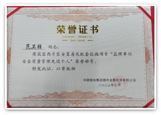 容西片區B3組團安置房項目總監理工程師、總監代表還被雄安集團城發公司授予“監理單位安全質量管理先進個人”稱號,這份榮譽與公司領導的關心和幫助還有全體項目員工的共同努力密不可分,項目總監理工程師代表項目全體員工表態,一定珍惜這份來之不易的榮譽,用更加嚴格的態度嚴把工程安全質量關,為實現容西片區高標準高質量交付的總體目標奮勇拼搏,為雙圓監理公司在雄安新區的發展做出更多貢獻。