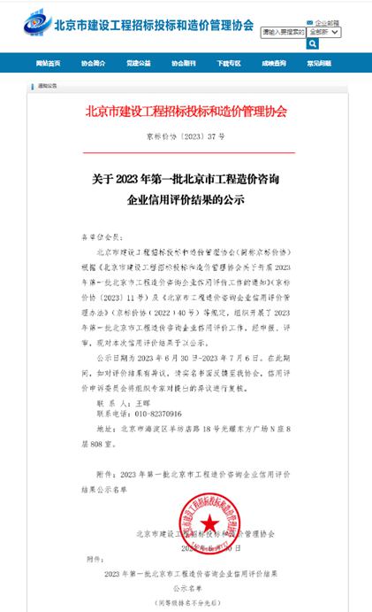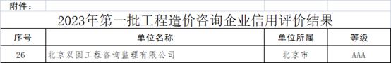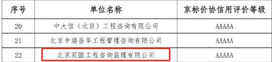 近日,中國建設工程造價管理協會、北京市建設工程招標投標和造價管理協會分別發布了《造價咨詢企業信用評價結果的公示》,北京雙圓工程咨詢監理有限公司榮獲中國建設工程造價咨詢企業信用評價等級“AAA ” 認證、北京建設工程造價咨詢企業信用評價等級“AAAAA”認證。