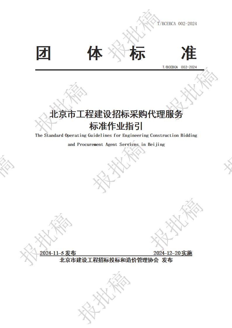 依據(jù)《北京市建設(shè)工程招標(biāo)投標(biāo)和造價(jià)管理協(xié)會(huì)團(tuán)體標(biāo)準(zhǔn)管理辦法(試行)》,《北京市工程建設(shè)招標(biāo)代理服務(wù)標(biāo)準(zhǔn)作業(yè)指引》團(tuán)體標(biāo)準(zhǔn)通過審查,北京市建設(shè)工程招標(biāo)投標(biāo)和造價(jià)管理協(xié)會(huì)已發(fā)布為團(tuán)體標(biāo)準(zhǔn),標(biāo)準(zhǔn)號(hào)為:T/BCEBCA 002-2024。該標(biāo)準(zhǔn)自2024年12月20日起實(shí)施。